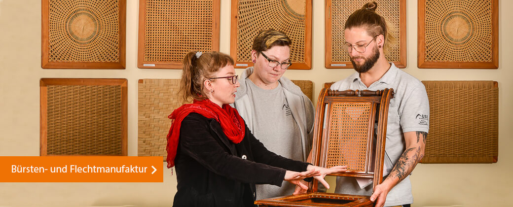 Hergestellt werden all diese schönen Dinge von Hand in Teams von behinderten und nicht behinderten Menschen in unseren Werkstätten in Berlin und Brandenburg. Hier pflegen wir zum Teil alte, vom Aussterben bedrohte Handwerkskünste wie das Flechthandwerk oder das Bürsteneinziehen. In jedem Fall können Sie bei uns sicher sein, dass Menschen mit handwerklichen Können und viel Liebe Ihr Produkt hergestellt haben.